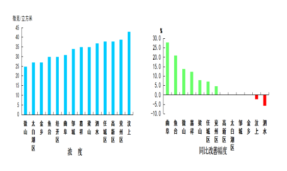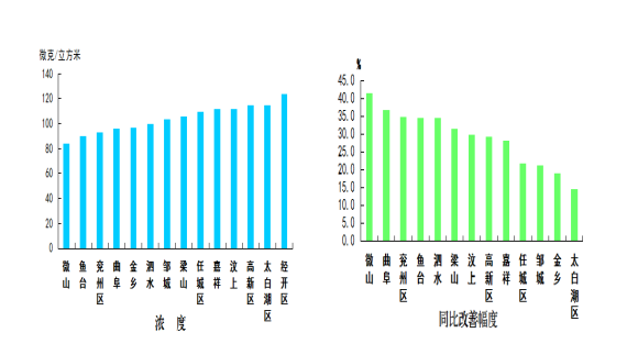 可吸入顆粒物濃度最好的縣(市、區(qū))是微山縣,為84微克/立方米;最差的縣(市、區(qū))是經(jīng)開(kāi)區(qū),為124微克/立方米;同比改善幅度最大的縣(市、區(qū))是微山縣,為41.7%,同比改善幅度最小的縣(市、區(qū))是太白湖區(qū),為14.8%。