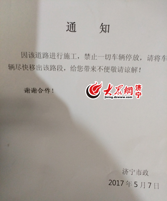 8日上午,記者在北玄帝廟街文昌閣小學路段看到,地上畫著白色的停車位線,停車位上停著的車都被貼上了通知,通知寫到“因該道路進行施工,禁止一切車輛停放,請將車輛盡快移出該路段。”通知落款為濟寧市政,但沒有加蓋公章。