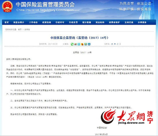 大眾網濟寧5月9日訊 據中國保監會消息,安邦人壽保險股份有限公司因報送的“安邦長壽安享5號年金保險”等產品備案材料中出現產品設計偏離保險本源的現象,規避保監會中短存續期產品的有關監管規定,擾亂市場秩序。同時,“安邦e起贏兩全保險(萬能型)”產品報備材料中的中短存續期產品董事會決議無總精算師簽字,不符合《中國保監會關于規范中短存續期人身保險產品有關事項的通知》第四條的規定。上述產品已被停止使用,自本監管函下發之日起三個月內,禁止該公司申報新的產品。