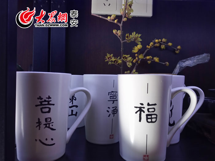 我是杯子控,看到各種圖案和樣式的杯子就喜歡買買買。“泰山禮物”里的馬克杯外形都是白瓷凈面,配不同《金剛經》石刻字,還是很超脫。著名的石刻經石峪《金剛經》,被譽為“大字鼻祖”、“榜書之宗”,兩千多平方米的大石坪僅殘存1000余字。其字個個端莊肅穆、樸拙渾厚,“不以小巧示人”,又同泰岱神韻高度融合,在馬克杯上,顯得與眾不同。還有光潔的白盤,盤上圖案由純手工打磨,刻紋清晰,設計制作堪為精品。