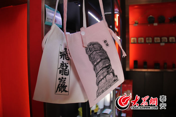 喜歡岱廟的漢柏、石刻和碑刻,喜歡宋天貺殿上的《泰山神啟蹕回鑾圖》壁畫,可它們卻很難被珍藏。直到,我在岱廟里一個展架上找到了“泰山禮物”。馬克杯、化妝隨身鏡、鼠標墊、帆布包、書簽、明信片等,6個系列26款手伴紀念品,全是帶有泰山元素的文化創意產品。