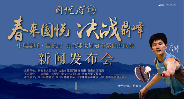 “春來國悅 決戰鼎峰”中瑞鼎峰國悅府羽毛球世界冠軍泰山挑戰賽由泰安鼎峰瑞岳置業有限公司聯合泰安市體育總會、省網媒集團泰安分公司主辦,大眾網泰安頻道承辦,是繼“王者之約 決戰老瓦”乒乓球世界名將瓦爾德內爾國際邀請賽之后的又一泰安體壇盛事。