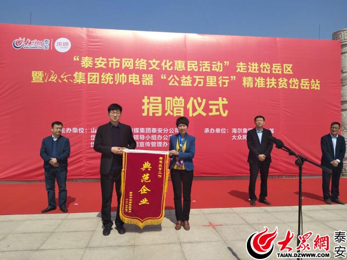 大眾網泰安3月27日訊(記者 田陽 見習記者 張冰)3月27日,由山東省網媒集團泰安分公司、岱岳區扶貧開發工作領導小組、岱岳區互聯網新聞宣傳管理辦公室主辦、海爾集團統帥電器、大眾網泰安頻道承辦的“公益萬里行”精準扶貧活動在泰安市岱岳區廣場舉行,海爾集團向33戶建檔立卡貧困戶捐贈總價值近3萬元的洗衣機33臺,同時,全區12069戶建檔立卡貧困戶領到了價值500元的家電優惠補貼卡。泰安市岱岳區副區長朱延華、省網媒集團泰安分公司負責人陶云江、海爾濟南中心運營總監婁鵬等領導出席活動儀式。