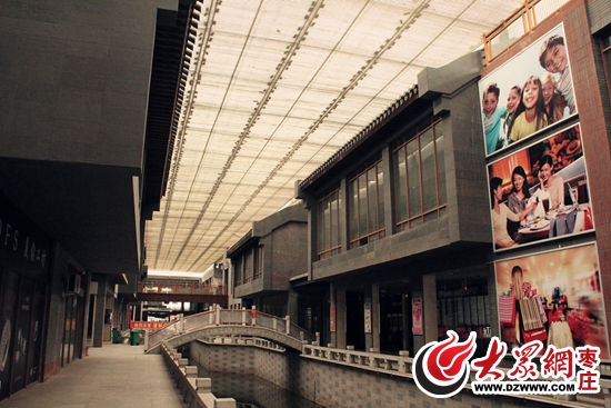 從2012年的繁華走過,魯南水城已經沉寂了很久。現在的魯南水城里,大大小小的招牌林立,五花八門,隨意走近一家商鋪透過玻璃窗,看到的卻是積滿灰塵、雜亂不堪的倉庫;魯南水城小橋回廊依然在這里,而水卻很久沒有流動,成了一片死水;從被太陽曬的暖意洋洋的馬路上走進水城,一股冷意會使你打幾個寒戰。環繞整個魯南水城,還在營業的商鋪只有十個左右,除一家餐飲、KTV外,其他商鋪多以廣告公司為主。