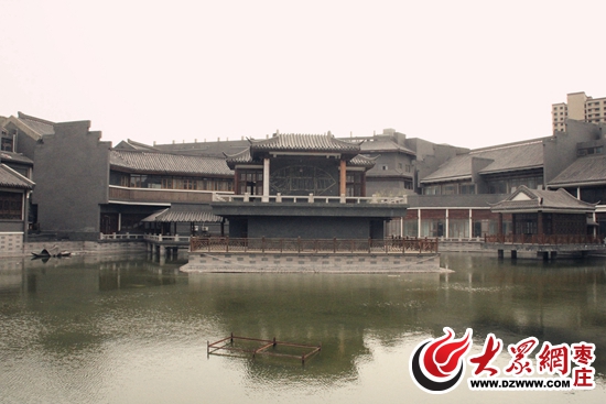 青灰色的磚墻,翹首的飛檐,一灣清河蜿蜒環繞著亭臺榭閣,長長的廊道寂靜悠長,在這些亭臺榭閣中央,矗立著一方三面環水的舞臺,一泊小船停靠岸邊。這一融合著徽派建筑、蘇州水鄉和北方民居建筑風格的11個水街、32座小橋形成了魯南水城。在規劃中,這片水城不僅是一座旅游地,它還是一個不夜城,燈光遍布大大小小的地方,一個長300米,投資1500萬元的天幕,是水城獨一無二的標志。