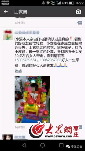 朋友圈轉發的“棗莊立交橋女童丟失”的信息
