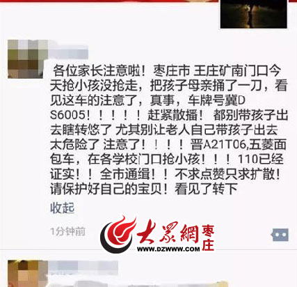3月20日左右,棗莊市民的朋友圈里又出現一則驚人的消息:有人在棗莊王莊搶孩子,還有家長被捅傷。棗莊警方于3月21日進行辟謠,表示并沒有接到類似警情,該消息為謠言。