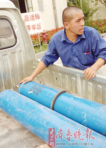 于先生帶著氧氣瓶來到生產廠家。 戴偉 攝