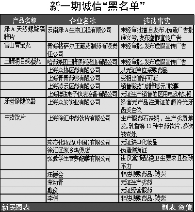 在被曝光的“黑名單”中,有12家企業(yè)和4名個人,在經(jīng)營活動中存在嚴重的違法行為。其中,莎莎化妝品(中國)公司無證進口化妝品;哈藥集團三精黑河藥業(yè)公司未經(jīng)審批,發(fā)布虛假宣傳廣告;云南綠A生物工程公司的“綠A天然螺旋藻精片”,未經(jīng)審批擅自發(fā)布,偽造廣告批準文號,發(fā)布虛假宣傳廣告。(晏秋秋)