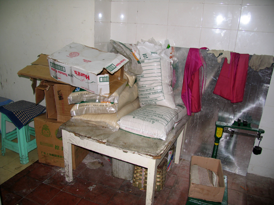 在去洗手間時,沿著店內張貼的衛生間導向標示,恰巧就走進了這家店的廚房。在廚房中,我們看到了熨衣板、破紙殼箱、面粉、地秤、抹布、圍裙、竹筐、電飯煲、用過沒用過的方盤、餐盒堆放在一個房間內。通過一個傳菜的窗口我們看到幾把爛拖布倒放在洗池邊上。這樣臟亂的廚房與店家宣傳的“ISO9001國際認證企業”著實相距甚遠。在廚房中我們拍下了幾張照片,在拍完照走出廚房之時才有人過來問“你們干什么?這是廚房不許拍照!”
