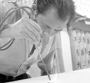 微山縣計(jì)生局辦公室主任靳光宏2000年突發(fā)奇想,創(chuàng)出了用火寫 字的獨(dú)門功夫。4年來(lái),他閉門苦練,研習(xí)用火在各類木料上進(jìn)行書 法創(chuàng)作。目前,他已創(chuàng)作出以楷、隸、行三種字體各4000個(gè)常用漢字 為代表的巨幅火書作品,開(kāi)創(chuàng)了一種有別于篆刻、毛筆、硬筆、烙書 等傳統(tǒng)書法藝術(shù)的嶄新領(lǐng)域————火書藝術(shù)。靳光宏因此被稱為“ 火書奇人”。 荷花節(jié)上 火書“閃光” 在2004年7月16日之前,靳光宏的火書還沒(méi)有幾個(gè)人知曉。改變 靳光宏火書創(chuàng)作命運(yùn)的,是微山縣委宣傳部副部長(zhǎng)、縣文化局局長(zhǎng)張 翔與縣政府辦公室副主任張吉平。二人在當(dāng)?shù)匚幕?nèi)頗具知名度, 因志趣相投早與靳光宏相識(shí)。 今年7月中旬,微山縣舉辦“第十一屆微山湖荷花節(jié)暨經(jīng)貿(mào)洽談 會(huì)”。身為組織者的張吉平與張翔力主將靳光宏創(chuàng)作的火書在荷花節(jié) 與洽談會(huì)開(kāi)幕當(dāng)天正式展出。 7月16日,由70余塊木板、共1.2萬(wàn)字組成的火書作品首次公開(kāi) 亮相,而靳光宏自己也在現(xiàn)場(chǎng)用氣焊槍改制的“火筆”筆走龍蛇。“ 目睹了他的表演后,圍觀的男女老幼,不管識(shí)字的還是不識(shí)字的,無(wú) 不嘖嘖稱奇。” 靳光宏的火書更引起了新聞媒體的極大興趣,“火書奇人”的美 譽(yù)不脛而走。 初練火書 險(xiǎn)釀火災(zāi) 雖為縣計(jì)生局辦公室主任,靳光宏現(xiàn)仍是工人身份。對(duì)此,他毫 不避諱:“我從小沒(méi)念多少書,16歲就當(dāng)?shù)V工,到現(xiàn)在還是個(gè)工人。” “我父親寫字很好,受他影響,9歲左右我就開(kāi)始練字。”兒時(shí) 的靳光宏對(duì)練字到了癡迷的程度,拖把、毛衣針“逮住什么用什么”。 1983年,由于工作需要,他經(jīng)常刻蠟紙印材料,“慢慢地,我開(kāi) 始有意識(shí)地練習(xí)一些名家碑帖。”從此,靳光宏不斷參加各級(jí)各類書 法比賽,并頻頻獲獎(jiǎng)。 1994年,全國(guó)第二屆硬筆書法家協(xié)會(huì)會(huì)員代表大會(huì)在京召開(kāi),他 作為代表參加了大會(huì)。“縣領(lǐng)導(dǎo)很重視,讓我牽頭成立了微山縣硬筆 書法協(xié)會(huì)。”靳光宏成為會(huì)長(zhǎng)。 在進(jìn)行書法創(chuàng)作多年之后,不愿循規(guī)蹈矩的靳光宏突然冒出一個(gè) “怪念頭”:用火能不能寫字? 2000年,他開(kāi)始嘗試用食用油、機(jī)油甚至汽油先寫好字,再用火 點(diǎn)著,以圖“油字”燃燒后在木板上“寫”下字跡。在用汽油試驗(yàn)時(shí), “‘騰'地一下子火就起來(lái)了,差點(diǎn)出事……”試驗(yàn)就此擱置下來(lái)。 不久,靳光宏看到金銀首飾匠在打造耳環(huán)時(shí),腳踩著風(fēng)箱,噴出 來(lái)的藍(lán)色火焰非常像毛筆的筆鋒。他動(dòng)了心。第二天,他就買來(lái)煤氣 罐、氧氣瓶、氣焊槍,開(kāi)始了真正的火書研習(xí)、創(chuàng)作。 "毛筆火筆 猶如夫妻" 靳光宏說(shuō),用火寫字也有“文房四寶”:火筆、燃?xì)狻⒛玖虾突?BR>源。“毛筆書法是以墨的濃淡,用筆的提、按及手腕的變化來(lái)控制書 寫效果的,而火書則是以火的溫度強(qiáng)弱、時(shí)間的長(zhǎng)短來(lái)調(diào)節(jié)書寫效果 的。” 張吉平在看了靳光宏的火書后評(píng)價(jià)道:“在遠(yuǎn)古刀耕火種時(shí)代, 人類用火為了生存,現(xiàn)在用火則是創(chuàng)造精神食糧。以前所謂‘力透紙 背’,而現(xiàn)在火書真正實(shí)現(xiàn)了‘入木三分’。” 而靳光宏對(duì)火書卻有自己的詮釋:“火是有靈氣的,盡管剛烈, 但也很溫柔。火書的美感效果完全可與傳統(tǒng)的毛筆書法相媲美。毛筆 是女人,火筆是男人,火書和毛筆書法在書法藝術(shù)表現(xiàn)形式的舞臺(tái)上 應(yīng)該是夫妻的共同表演,火書的出現(xiàn)完成了書法藝術(shù)的歷史姻緣。” 甘苦自知 樂(lè)在其中 知之不如好知,好知不如樂(lè)知。這句話用在靳光宏身上尤為貼切: “一拿起火筆,我精神頭就來(lái)了,如入無(wú)人之境。看到火苗在木板上 跳舞,我也想跳舞。” 然而,在家人及同事眼中,靳光宏的“樂(lè)”是用常人難以忍受的 “苦”換來(lái)的。 微山縣計(jì)生局局長(zhǎng)黃書華說(shuō):“晚上下班后他就把自己關(guān)到小屋 里練習(xí),回家最早也得晚上12點(diǎn)。最難受的是夏天,他練火書的小屋 不透風(fēng),酷熱難耐,蚊蟲叮咬,這可不是一般的苦。” 現(xiàn)在山東體育學(xué)院上大三的女兒靳佼佼,對(duì)靳光宏練火書經(jīng)受的 辛苦十分心疼:“爸爸有心臟病,夏天都熱暈過(guò)兩次。” 妻子楊桂萍已下崗十幾年。“一開(kāi)始,我也挺生氣,畢竟投資太 大了,到現(xiàn)在得投入三四萬(wàn)元了。俺家的房子10年前什么樣,現(xiàn)在還 是什么樣。”楊桂萍說(shuō),“但這總比在外面瞎混強(qiáng)。這是正事兒。” 幾多困惑 幾多希望 靳光宏及其周圍的人都認(rèn)為,他創(chuàng)造了一種前無(wú)古人的書法藝術(shù) 形式————火書。今年6月1日,靳光宏給中國(guó)書法家協(xié)會(huì)寄去一封 信,講述了自己研習(xí)與創(chuàng)作火書的情況,希望中國(guó)書協(xié)給予鑒定。遺 憾的是,他一直沒(méi)有收到復(fù)函。不久,他又向上海大世界吉尼斯總部 