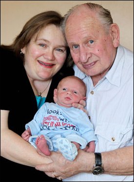 圖為74歲的英國老翁蓋里和40歲妻子道恩抱著他們的新生嬰兒賴恩