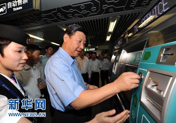 8月23日,中共中央政治局常委、國家副主席習近平在北京調研。這是習近平在北京地鐵四號線中關村站,了解北京軌道交通建設情況。 新華社記者饒愛民攝