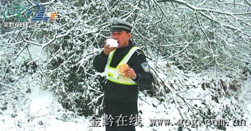 在網上一組專題報道中,標題為《貴州遵義交警抗凝凍,啃雪堅守崗位》的系列照片,引起了網民關注。其中有交警在道路上設卡值勤,也有交警幫過往司機推車的情景,而一張交警“啃雪”吃面包的照片,尤其讓人印象深刻,至今已有1108條評論。記者注意到,照片中的交警臉被凍得通紅,他左手拿著面包,右手拿著一團雪,正放在嘴里啃。