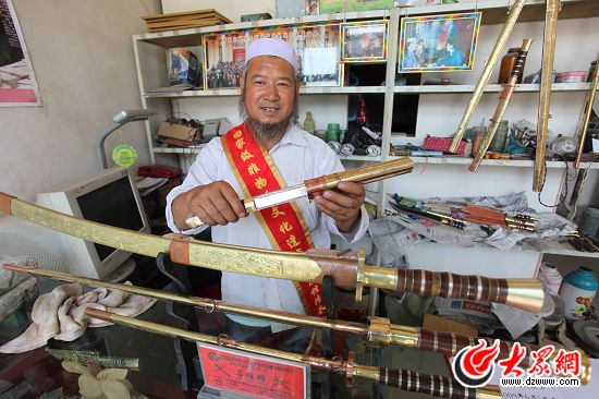 保安族腰刀“國家級項目傳承人”馬維雄展示他打制出來的刀。