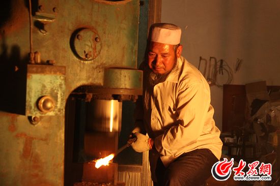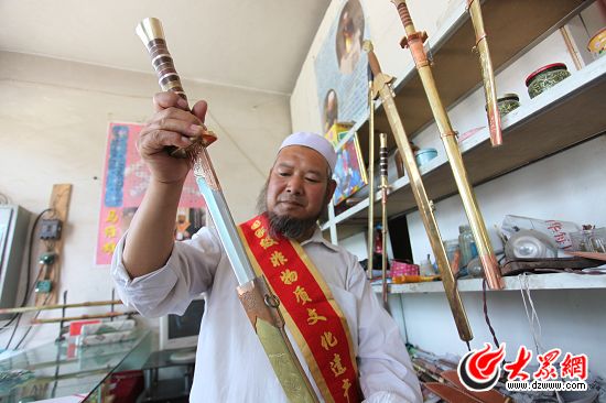 保安族腰刀“國家級項目傳承人”馬維雄向記者展示剛剛打制出來的佩刀。