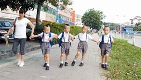 本報2006年曾報道的深圳四胞胎在社會各界及父母的關愛中長大了,9月3日開始上小學。4個面相身高差不多只有媽媽分得清的孩子,如何讓老師、同學區分?媽媽譚女士左思右想,決定給4個兒子剃個“數字頭”,使在石巖上屋小學就讀的4兄弟不會給老師、同學造成“困擾”。