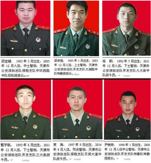 他們是,開發(fā)區(qū)公安消防支隊(duì)尹艷榮、甄宇航、楊鋼、邵俊強(qiáng),保稅區(qū)公安消防支隊(duì)田寶健、袁海。另外,有18名消防官兵失去聯(lián)系,66名消防官兵受傷。