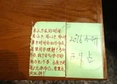 “考研黨”占座方法可謂是各不相同,有的只是簡單地在桌子上貼上“2016考研占座”;有的則直接將自己的課本或是考研資料堆放在了桌子上;更有甚至在留言條上放出了“重占血拼”的“狠話”。
