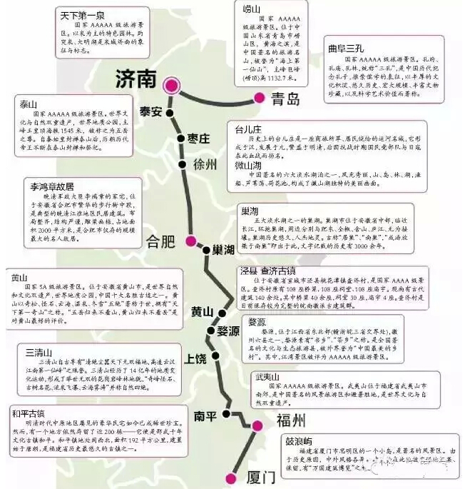 這趟高鐵線經(jīng)由膠濟(jì)、京滬、合福等線路,途經(jīng)山東、安徽、江西和福建,從青島直達(dá)廈門。