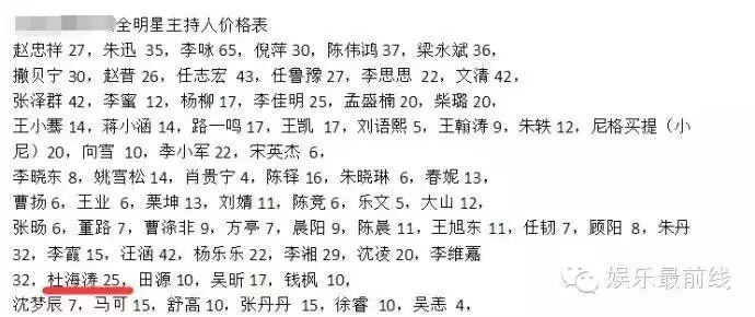 湖南臺一哥、擁有多檔節目的汪涵曾自曝一年的主持酬勞大約是稅后24萬多一點,而作為二線咖甚至三線咖的杜海濤在湖南臺所領取的主持酬勞應該遠遠低于汪涵,但是杜海濤的商演價卻非常高,一床情書在網上看到一份2014年的主持人商演報價單,杜海濤為每場地25萬起價,遠超吳昕,田源,錢楓等人,因此也就說明,《快樂大本營》的那點工資對于杜海濤來說簡直可以忽略不計。