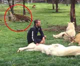 ▲你給我鏟屎,我護你周全。近日,墨西哥一名飼養員,與獅子玩耍時險被一只豹子“從后偷襲”,所幸其身后另一只老虎出手幫他擋住撲過來的豹子(圖)。不過也有網民指出,該處是“大貓”們的庇護所,這只花豹其實只是鬧著玩。(環球網)