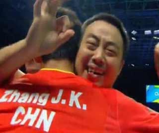 乒乓球比賽今日收官,在壓軸的男團決賽中,馬龍、張繼科、許昕領銜中國“天團”3-1戰勝日本隊,完成三連冠,中國也連續三屆奧運會包攬乒乓球項目全部金牌。與張繼科擁抱慶祝時,總教練劉國梁嘴里叼了個戒指(圖)。原來,今天是劉國梁和妻子10周年結婚紀念日。
