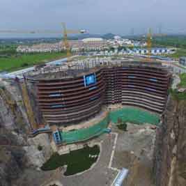 ▲近日,位于上海松江的“深坑酒店”已基本完成其地下工程的建設,預計2017年底竣工并試營業。酒店海拔負65米,有望成為世界上人工坑內海拔最低的酒店(圖),酒店將擁有370間客房,包括地上兩層、地下17層和水下兩層。(東方網)