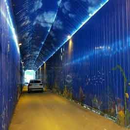 ▲美翻了!近日,濟南一小區(qū)入口處因施工而用鋼板搭起了一個臨時的通道供車輛行人安全通行,但在這簡陋的臨時施工通道上,有人描繪成了一個絕美的海底隧道(圖),行走其間讓人感覺十分夢幻。(大眾網(wǎng))