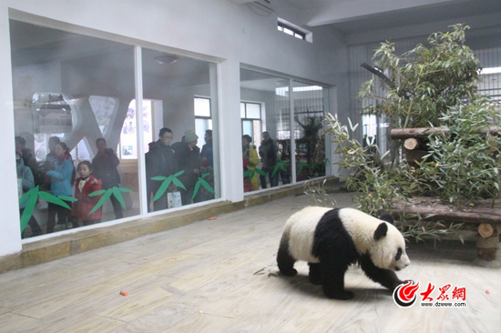 大眾網濟南2月6日訊(記者 赫洋 韋輝)今天上午,濟南市動物園大熊貓新館正式開館納客,兩只剛剛從四川臥龍碧峰峽基地引進的大熊貓也第一次與濟南市民見面。為了一睹“國寶”的風采,不少前來參觀的市民都特意起了個大早。而兩個小家伙也十分“給面子”,一會打滾,一會玩“倒立”,絲毫都不“認生”。