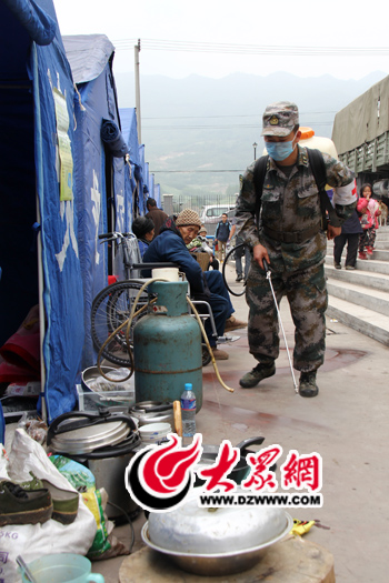 4月21日下午,解放軍戰士在龍門鄉臨時救援點噴灑消毒液。大眾網特派記者攝