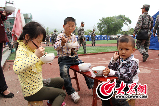 4月21日中午1點左右,在龍門鄉的救援帳篷門外,三個稚子正在吃午飯。大眾網特派記者攝