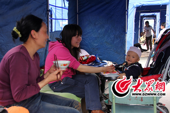 分到帳篷的年輕媽媽文太月(中)正哄著孩子吃午飯。她說,有了帳篷,就能睡個安穩覺,只要人還在,心里就踏實。大眾網特派記者攝