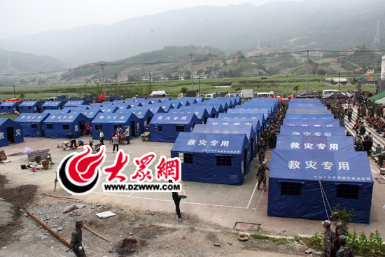 在本次地震中,蘆山縣龍門鄉成為受災最嚴重的地區之一,全鄉絕大多數房屋在地震中受損,成為危房。地震發生后,不敢回家住的鄉親們無奈地在馬路兩側用塑料布、帆布、床單等搭建起臨時的避難帳篷。從今天早上開始,救援人員開始將救援帳篷送入龍門鄉,早已駐扎在此的解放軍戰士和武警官兵每6人一組,迅速將首批帳篷搭建在空曠的龍門山希望小學操場上,然后分發給受災群眾,“每個帳篷搭建大約花費15分鐘,我一上午的時間已經搭了7頂帳篷了。”今年19歲的解放軍戰士王子揚說。