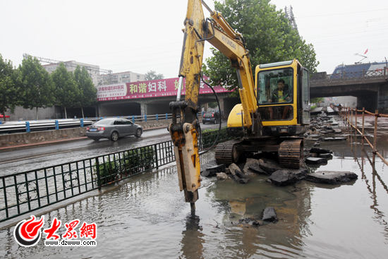 大眾網記者發現,在歷山路鐵路橋西側還有一處“噴泉”, 非機動車道上一個井蓋被地下水道的積水頂了起來,自行車和行人只能淌水經過。在井蓋附近約兩百米的路段上,一輛挖掘機正在進行施工。施工人員告訴記者,他們正在進行管道改造和安裝排水泵。“一下暴雨,水都流進下水道了,來不及流走就容易把井蓋頂起來。排水泵安好了,就能及時排走這些積水。”