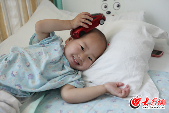 此時的小林羲正躺在媽媽的懷里,手里把玩著一個小汽車模樣的收音機,看到記者來,他顯得十分好奇。小林羲長得虎頭虎腦,若不是右腳上粘著留滯針,很難感覺他是個“怪病娃”。