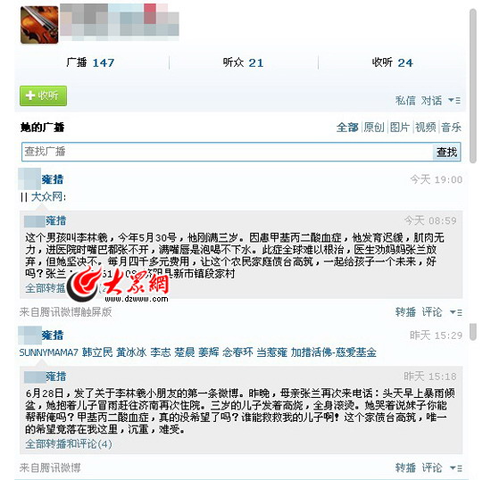 大眾網濟南7月26日訊(記者 盛堃)“昨晚張蘭再次來電話:頭天早上暴雨傾盆,我抱著兒子冒雨趕往濟南再次住院。三歲的兒子發著高燒……甲基丙二酸血癥,真的沒希望了嗎?誰能救救我的兒子啊!”從25日開始,接連兩天,網友“雍措”在騰訊微博上連續@大眾網,發出求助。女兒一次偶然的住院,讓她結識了病房里的張蘭母子,張蘭3歲的兒子小林羲身患甲基丙二酸血癥,屬于難以根治的一種罕見病,為了讓兒子有活著的希望,李家已經舉債20萬,家徒四壁。為了幫助素不相識的這對悲慘母子,“雍措”通過微博發出了愛的求救。