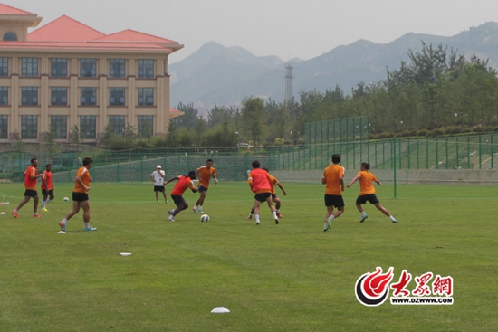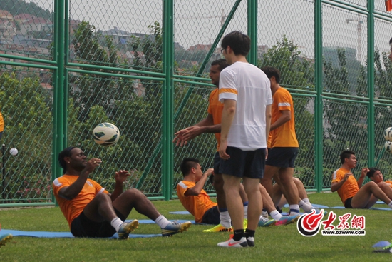 今天上午10:00,山東魯能泰山隊在基地3號球場進行公開訓練,以備戰(zhàn)周末同上海申花隊的中超聯(lián)賽。雖然天氣非常炎熱,但現(xiàn)場還是來了100多位熱情的球迷觀看訓練。