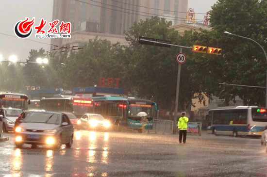 下午18點11分,在歷山路與和平路口,交警在大雨中指揮交通。見習記者 劉明明 攝