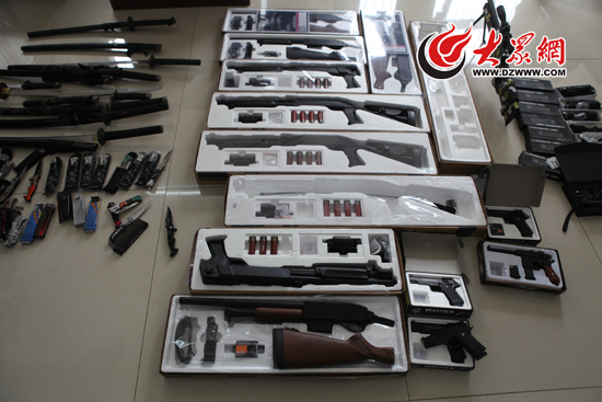 大眾網濟南5月14日訊(記者 張建)自今年初以來,濟南市濟青高速服務北區某超市女老板郭某為了賺更多的錢,在超市內非法銷售起了國家明令禁止買賣的仿真槍支、彈藥,以及管制刀具。5月11日晚,這些仿真槍支和管制刀具被夜間巡邏的民警當場查扣,郭某也被治安拘留。