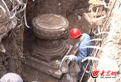 大眾網濟南12月2日訊(記者 韋輝 盛堃)11月23日,濟南市縣西巷一電纜施工現場發現佛教經幢底座引起了社會各界的關注。經過幾天的現場發掘,12月2日下午,濟南市考古研究所正式對這個經幢底座進行起吊挖掘。由于歷史原因,這個經幢底座最上面一層已經斷裂。另外,由于體積和重量較大,考古人員采取了分段起吊。截止下午五點,底座最上面的一塊圓形凹槽被起吊完畢,剩下的經幢底座將于3日繼續挖掘。