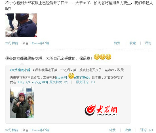 大眾網對團購全程進行了微博直播,關注此事的網友不斷留言。“很多網友都說很好吃啊,大爺自己親手做的,保證甜!”在微博中,網友“大濟南的小妮 ”說,我和我媽吃了第一個之后,第一反映就是買少了,哇咔咔,真好吃啊。