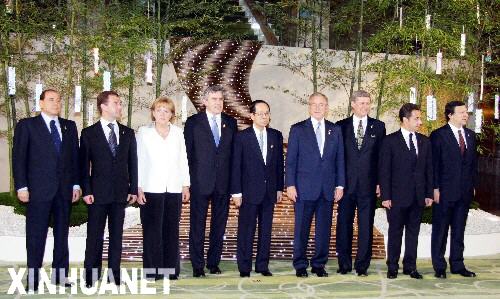 7月7日,在日本北海道洞爺湖,參加八國集團首腦會議的領導人在竹子裝飾前合影,從左至右依次為意大利總理貝盧斯科尼、俄羅斯總統梅德韋杰夫、德國總理默克爾、英國首相布朗、日本首相福田康夫、美國總統布什、加拿大總理哈珀、法國總統薩科齊和歐盟委員會主席巴羅佐。 新華社發