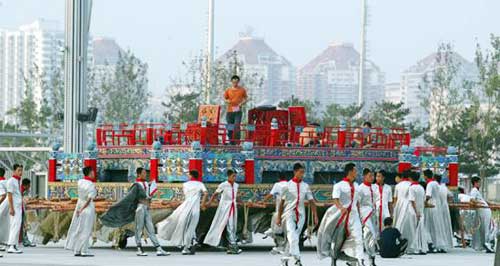 北京奧運會開幕式于近日在守衛森嚴的中國國家體育場(“鳥巢”)舉行首次大規模帶妝彩排,據了解開幕式將長達三個半小時,其中包括50分鐘的表演節目、運動員進場儀式,昨天,記者趁演員們排練間隙出來“放風”,搶拍了幾張演員們休息的照片。