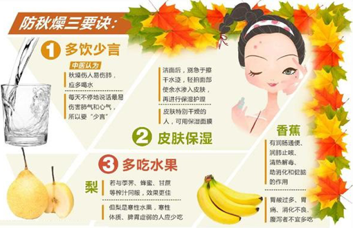 首先,在飲食方面多吃蔬菜、水果,因為這樣能補充人體的津液,有生津潤燥、清熱通便的功效;還可多吃些以蜂蜜、百合、蓮子、胡蘿卜、藕、梨、芝麻、木耳等清補之品所煮的百合粥、甜漿粥、牛乳粥等。不要吃冰鎮的水果、喝冰鎮飲料,因為寒氣會傳到肺里。