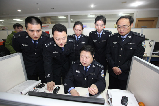 濟南市公安局長清分局大學路派出所所長靳宗兵與民警一起回答網友和讀者提問。(曹亮 攝)