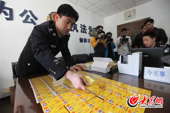 民警展示收繳的“福彩3D”詐騙案中的“會員卡”