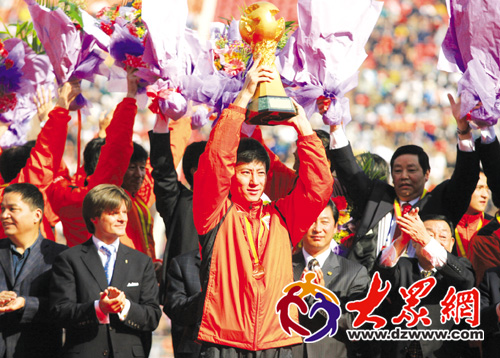 10月29日,中超聯賽頒獎儀式在山東體育中心進行,山東魯能足球隊隊長舒暢舉起中超冠軍獎杯——火神杯,鄭智、李金羽羽及圖巴分獲最佳球員、最佳射手和最佳教練稱號。作為今年中超聯賽的金牌球市,魯能隊所在的濟南賽區榮膺今年中超聯賽最最佳人氣獎。 |
