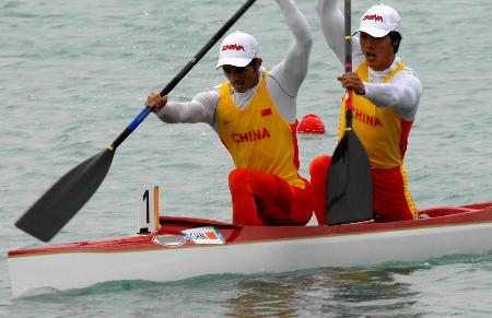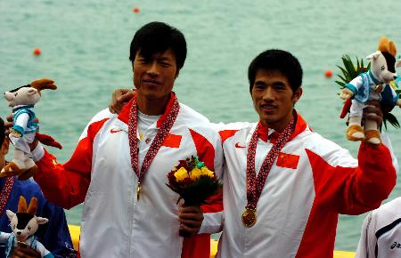 12月11日,中國選手馬校杰/黃少坤(右)在頒獎儀式上。當日,馬校杰/黃少坤在多哈亞運會男子1000米雙人劃艇決賽中獲得金牌。