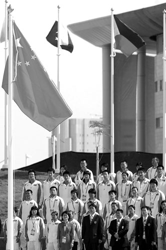 舉行升旗儀式的亞運村國際區是一個圓形廣場,處在亞運村的南端。由于中國代表團備受關注,原定于11時30分舉行的升旗儀式延遲了5分鐘開始!
